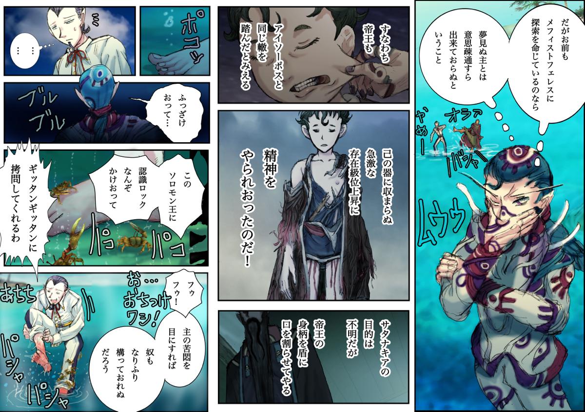 だがお前も メフィストフェレスに 探索を命じているのなら 夢見ぬ主とは 意思疎通すら 出来ておらぬと いうこと すなわち 帝王も アイソーポスと 同じ轍を 踏んだとみえる 己の器に収まらぬ 急激な 存在級位上昇に 精神を やられおったのだ! サタナキアの目的は 不明だが 帝王の身柄を盾に 口を割らせてやる ふっざけ おって… … … この ソロモン王に 認識ロックなんぞ かけおって ギッタンギッタンに 拷問してくれるわ フゥ フゥ! 主の苦悶を 目にすれば 奴も なりふり 構っておれぬ だろう